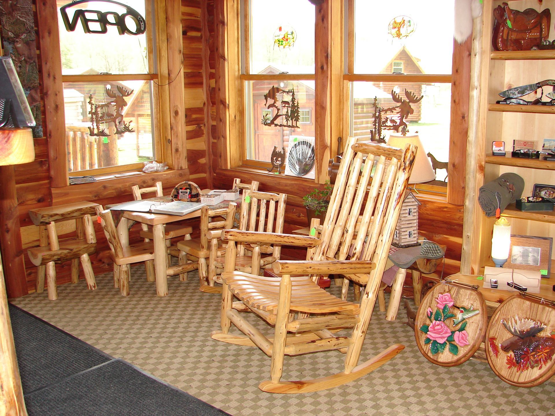 Come see a large selection of log furniture on display in our cabins. Click on a button below to see a gallery of featured items. Don't see exactly what you want? We will custom build it for you!