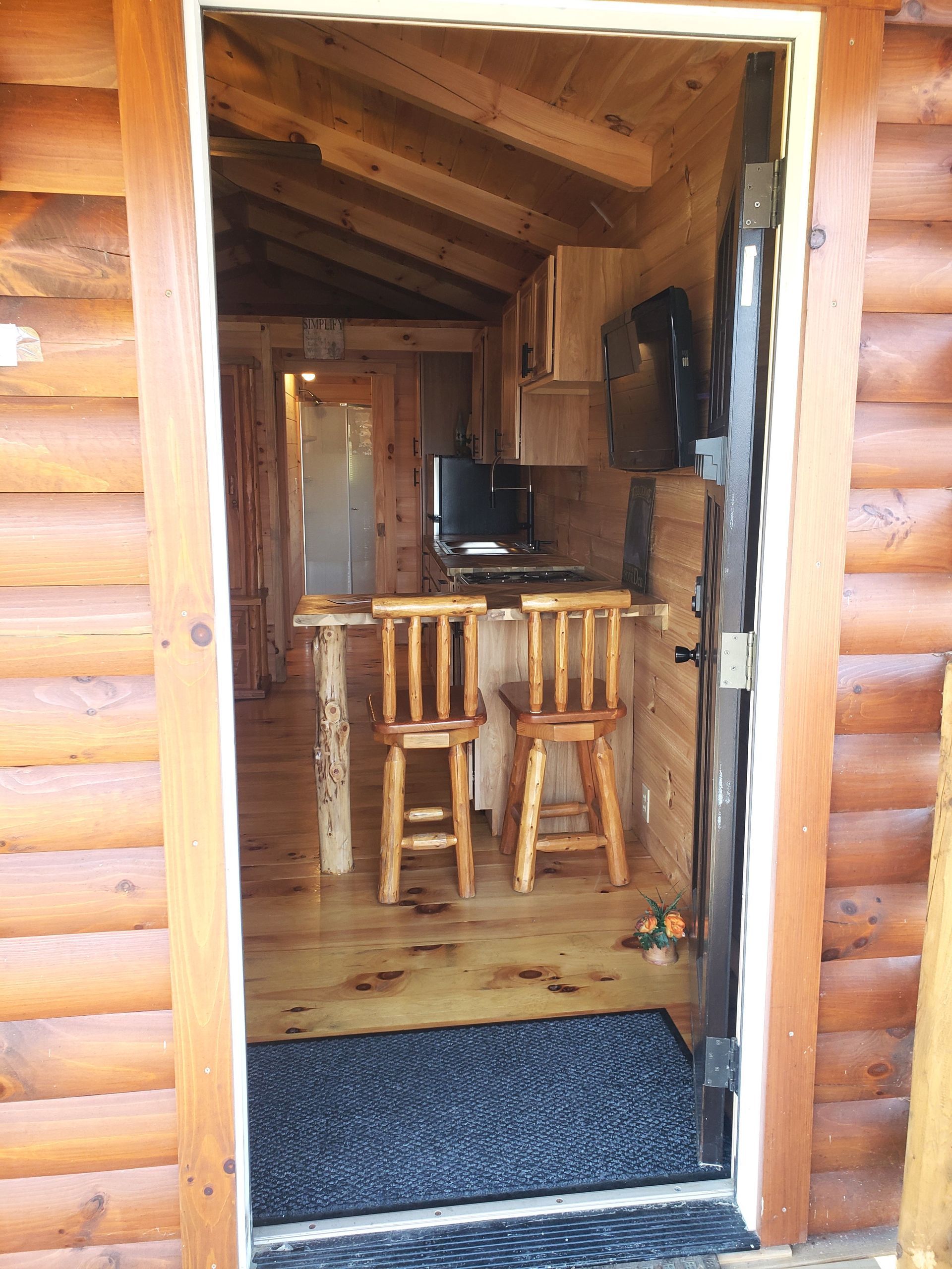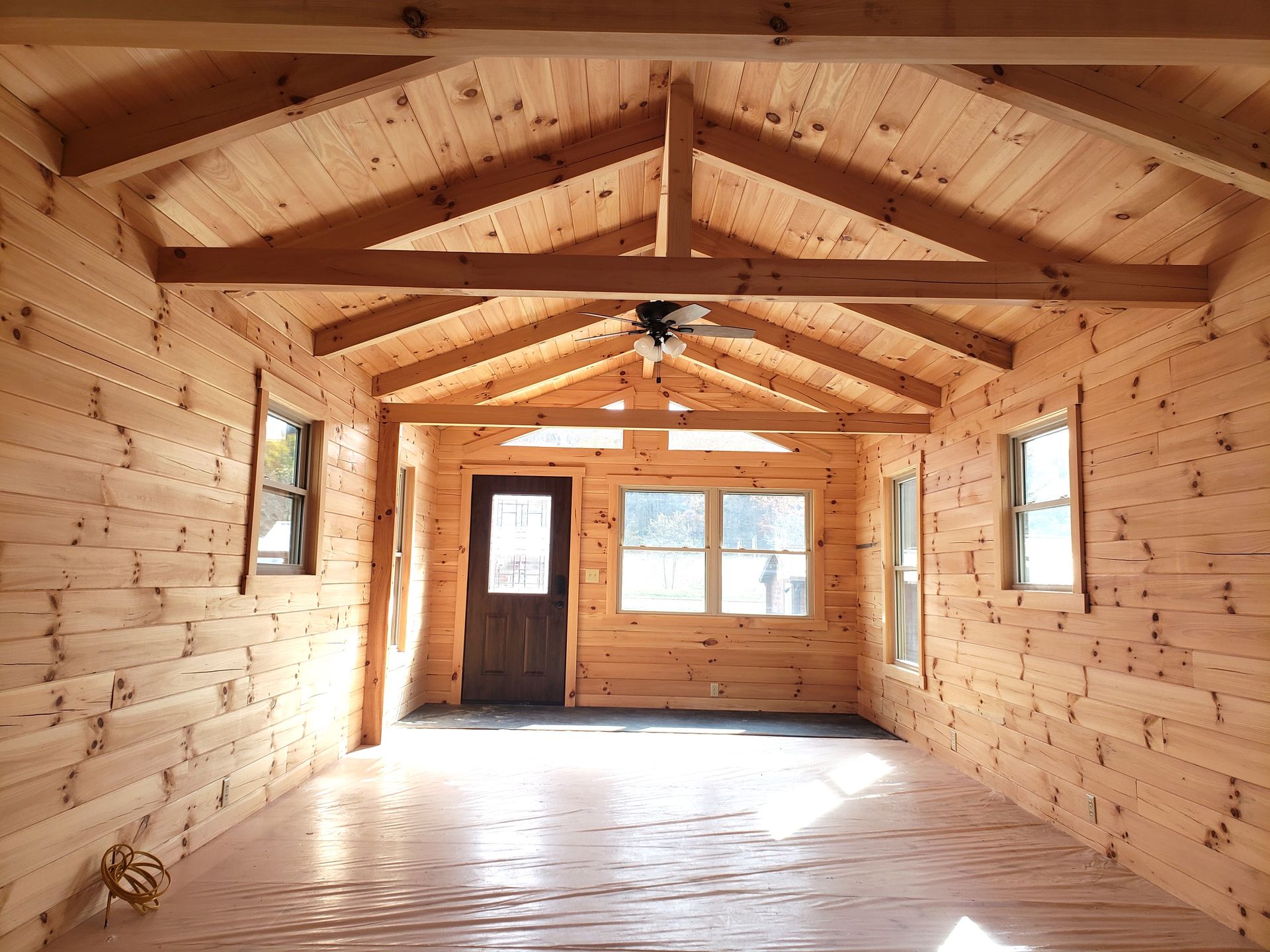 - Rough sawn outside with chinking, tongue and groove smooth finish on inside.